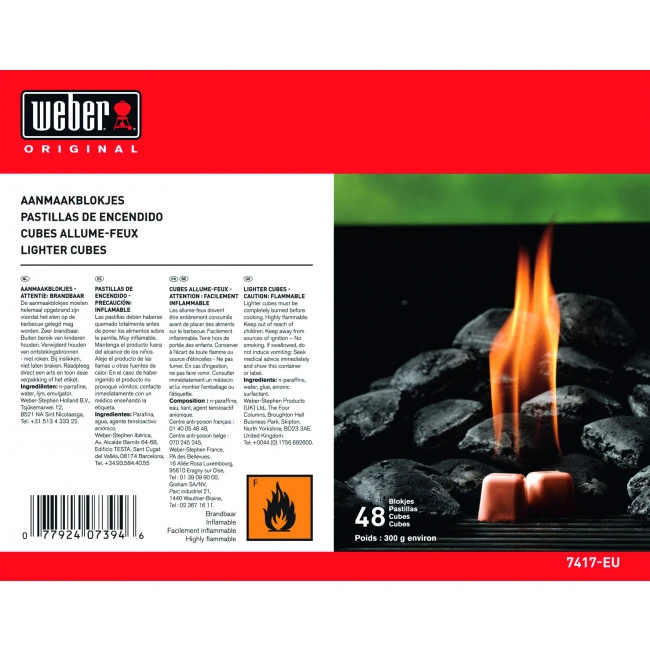 Les cubes allume-feux Weber® constituent donc un excellent moyen d’embraser votre charbon ou vos briquettes. En les associant à la cheminée d’allumage Weber®, vous obtenez un moyen rapide et efficace d’allumer votre barbecue.