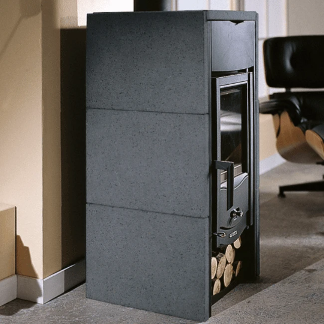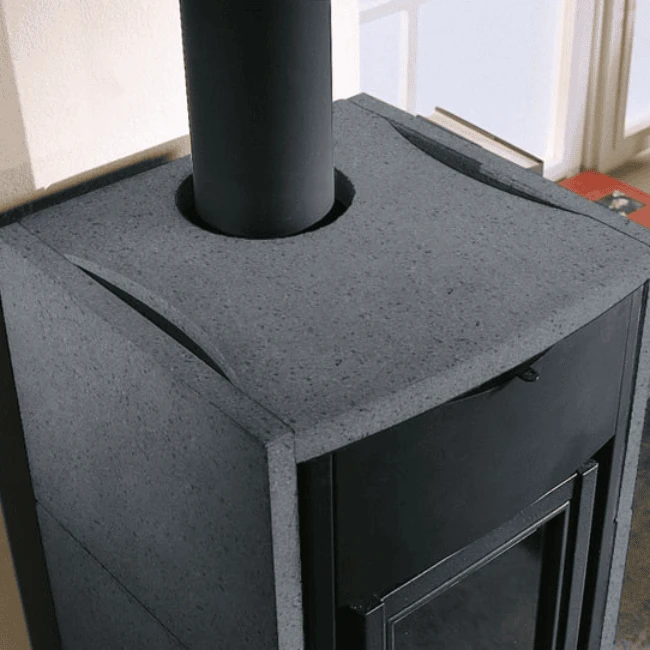 Son revêtement en pierre naturelle, tout comme sa porte et son foyer en fonte, lui permettent d’emmagasiner la chaleur émise et de la restituer durant de nombreuses heures après l’extinction du feu.