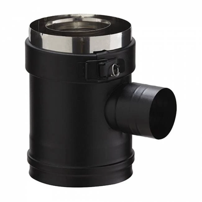 Élément droit de prise d’air à 90° permettant de raccorder un poêle à granulés bois en configuration concentrique. Le raccordement entre la buse d’arrivée d’air de l’appareil et le piquage (Ø60) de l’élément droit de prise d’air est réalisé en flexible (acier galva par exemple).