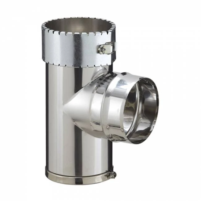 Té venant se fixer à l’extérieur du flexible en partie basse à l’aide d’un collier a griffes. Son Tampon bas démontable facilite les opérations de ramonage.